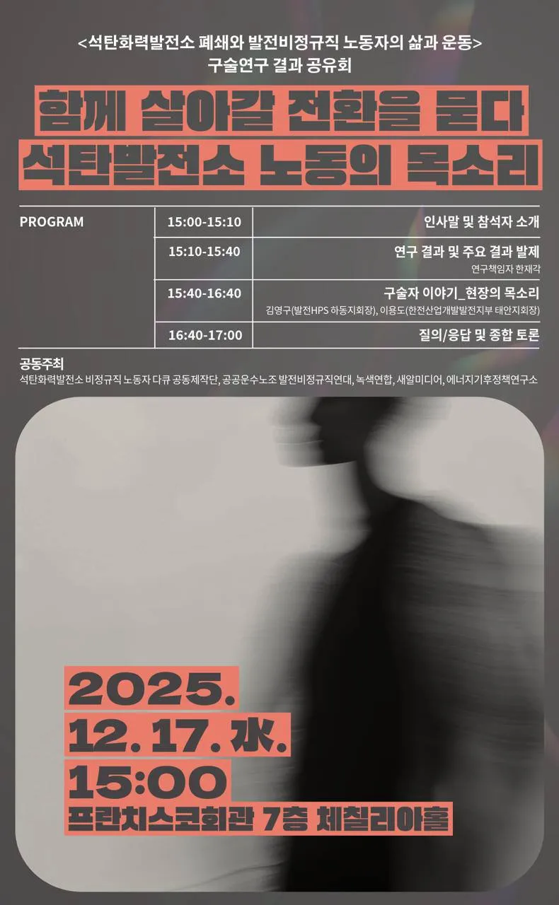 2025년, 태안 1호기 폐쇄를 시작으로 석탄발전소의 폐쇄가 코앞까지 다가왔습니다. 그 변화의 한복판에서, 발전비정규직 노동자들은 총고용보장과 정의로운 전환을 요구하며 긴 싸움을 이어왔습니다. 이번 구술연구는 석탄발전비정규직 노동자의 생애사와 함께 석탄발전소 폐쇄 국면에서 발전비정규직 노동자들이 겪는 노동의 현실과 불안, 그리고 정의로운 전환의 의미와 투쟁의 과정을 담아낸 기록입니다. 공유회는 구술연구에 대한 간단한 발제 이후, 구술에 참여했던 노동자들이 자신의 경험과 생각을 직접 이야기하는 시간으로 진행됩니다. 발전소 폐쇄를 둘러싼 고민과 불안, 지역과의 관계, 기후정의운동과 연대의 경험 등 함께 살아가기 위한 전환의 길을 현장의 목소리로 나누는 따뜻하고 다정한 대화의 자리로 마련하고자 합니다. 기후정의와 정의로운 전환을 위해 함께 하는 여러분의 많은 참여를 바랍니다.